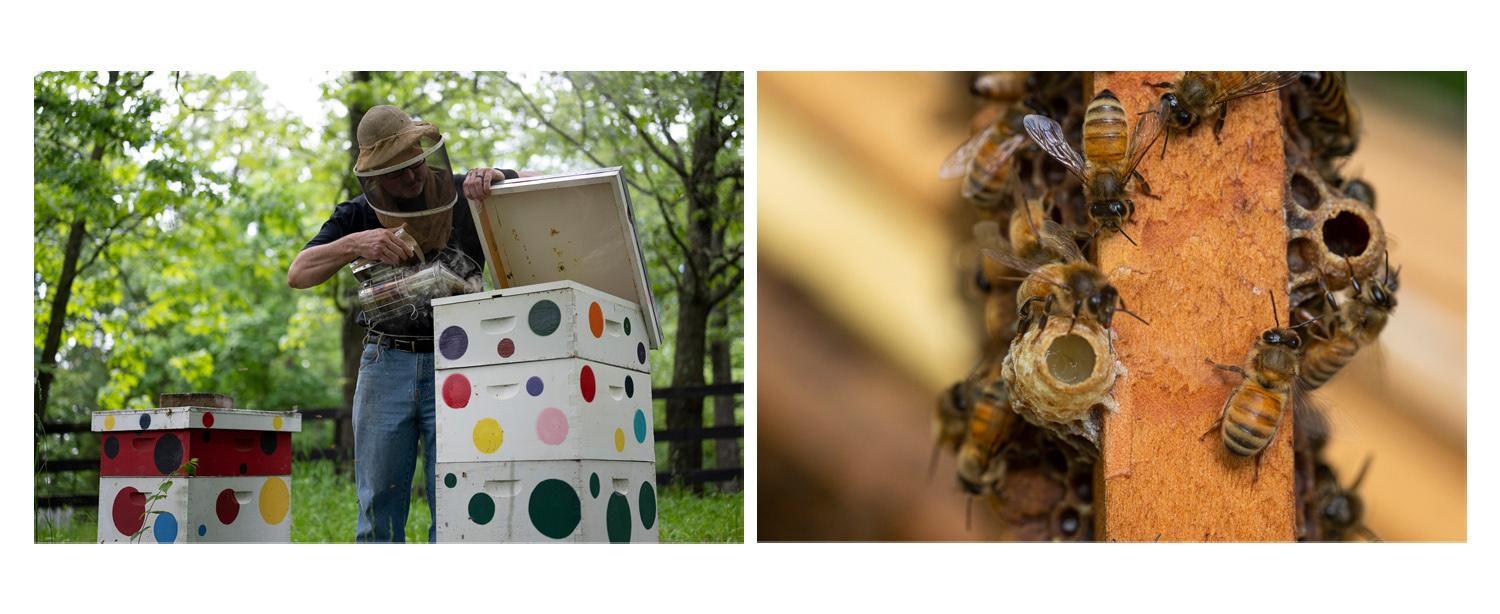 (left) Scott Allred, a beekeeper in Wildwood, tends to his hives. Allred has been capturing wayward bee swarms in the St. Louis area since 2012. (right) Honeybee colonies typically produce multiple queens before swarming. The queens develop in special cells, like those shown here. (May 20, 2020 for St. Louis Public Radio | https://news.stlpublicradio.org/health-science-environment/2020-05-20/st-louis-beekeepers-net-backyard-swarms-even-during-pandemic)